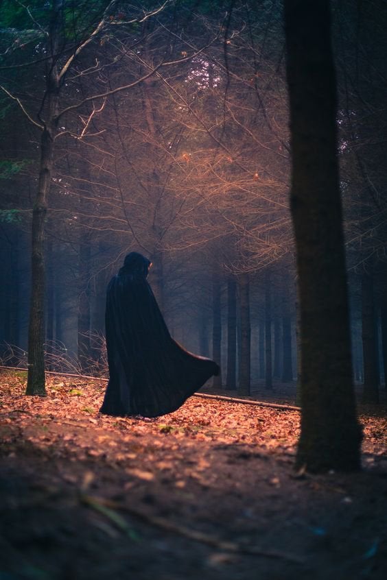 A breeze blew across the road causing a swirl of leaves to dance and the hem of the cape to sway. She ducked her head as if bowing in apology but remained silent. His anger cooled, “Do you need help?” She turned away in response. “Are you okay,” he asked concerned, stepping a little further from his car. She lifted her head again and he saw her deep emerald eyes like a cat staring in the darkness as a chill passed through him.